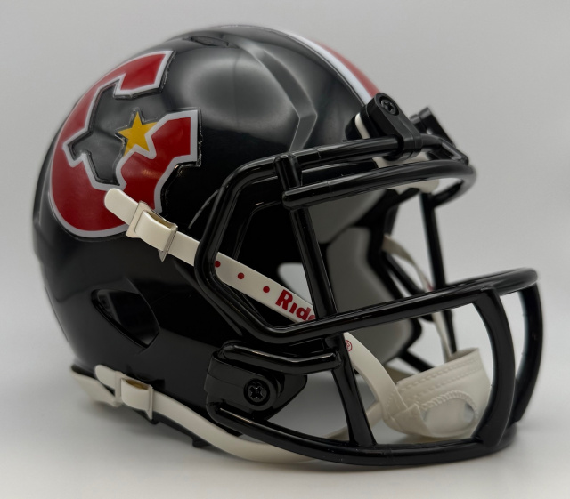 USFL Mini Speed Football Helmet. The ultimate USFL mini speed football helmet collectible, perfect USFL mini speed football helmets for autographs and collectors. Mini Speed Football Helmet with great graphics. Official USFL Mini Speed Football Helmet with official USFL team decal. ABS plastic Mini Speed Football Helmet shells with plastic facemask. Realistic interior foam padding, vinyl-leather chin strap. This is an affordable USFL football helmet for the true fan. Size: 1/2 scale versions of NFL football helmets. Size: 6"(L), 4½"(W), 5"(H) - (NOT FOR WEARING)